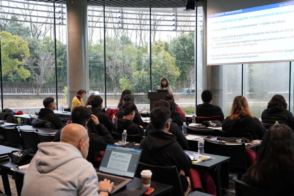 続いて、ユネスコチェアの小笠原理恵准教授が、大阪大学の保健医療分野での取り組みや、大阪大学で発足した MeW(Menstrual Well-being)プロジェクトについて紹介しました。MeWプロジェクトでは、月経に関する課題への取り組みとして、学内学生への無料生理用品を設置などの活動を行っています。質疑応答では、これらの取り組みが南アメリカでは十分に共有できていない点が課題として挙げられました。